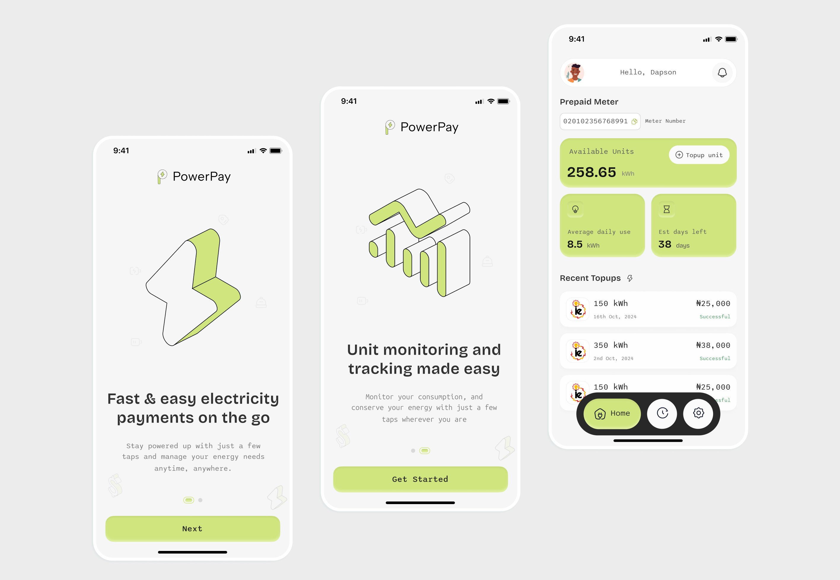 User interface for an Electricity unit Purchasing & Monitoring app showing the onboarding and home screens in light and dark mode. Balancing enhanced retro aesthetics and prominent icons.
